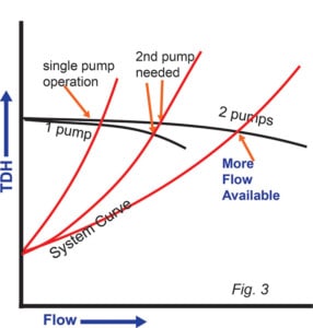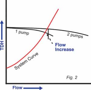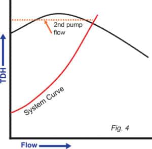 在圖 4 中,系統(tǒng)曲線和 TDH 曲線在大于關(guān)閉 TDH 值的 TDH 和低于曲線的最大 TDH 的 TDH 處相交。當(dāng)?shù)诙䝼泵啟動時,流量將僅增加到 TDH 與系統(tǒng)壓力匹配的第一個點。
