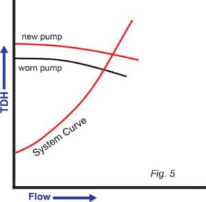 當(dāng)一個泵磨損時,可能會出現(xiàn)類似的情況。這在圖 5 中有所提及。隨著泵的磨損,在任何給定流速下產(chǎn)生的 TDH 量都會減少。如果新泵與系統(tǒng)曲線的交點并聯(lián)在磨損泵的關(guān)閉TDH之上,它將迫使磨損泵進(jìn)入關(guān)閉狀態(tài)。