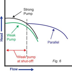 如果一個泵表現(xiàn)出較低的關(guān)閉 TDH 特性,它將在關(guān)閉狀態(tài)下運行,直到主導(dǎo)泵在其曲線上移動足夠遠(yuǎn),以至于其 TDH 低于具有較低揚程的泵的關(guān)閉 TDH(圖 5 )。