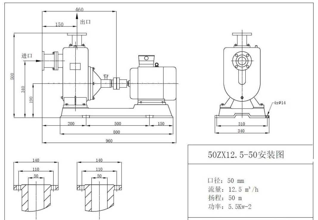 50ZX12.5-50自吸泵安裝尺寸