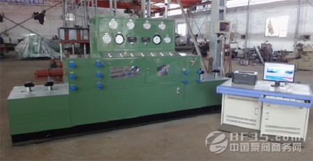 圖為YFS-ZC200t型智能型油田閥門專用試驗臺是國內水壓試驗壓力最高的試驗臺,最高試驗水壓為157.5MPa,均采用數據采集系統和遠程控制系統,符合API6A油田閥試驗標準,以及確保人員安全試驗。使用于江蘇宏泰石化機械有限公司等單位。